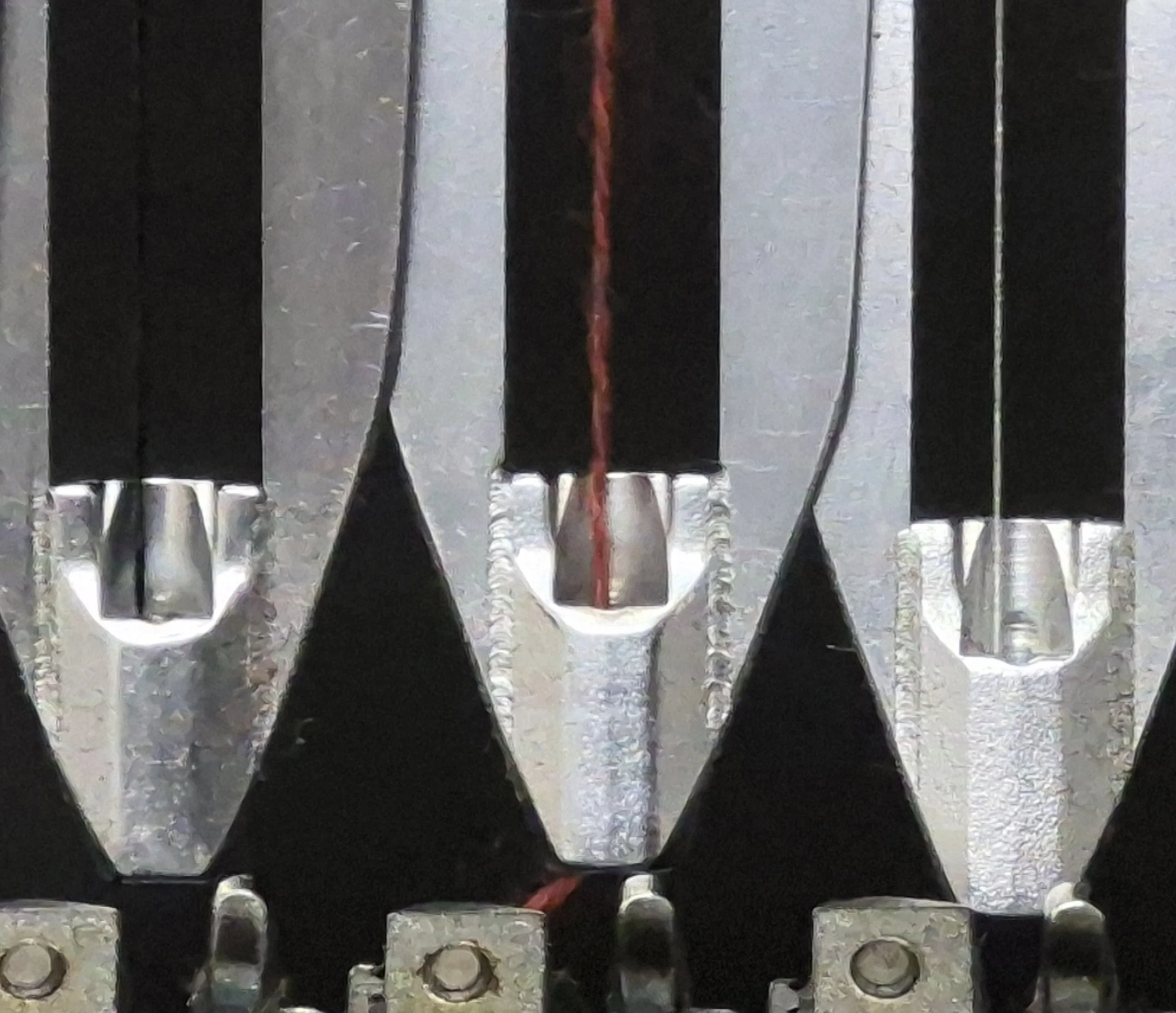 The image below shows the feeders on a knitting machine and to explain context, the holes the yarn is passing through are approximately 3 - 4 mm in diameter. Not exactly inches but millimetres that define the technology to change movement analysis for the next 50 years. The yarns form structures that allow Footfalls & Heartbeats to monitor and analyse movement in almost any setting. This analysis forms the basis of understanding behaviours and by simple extension the ability to “change those behaviours”.